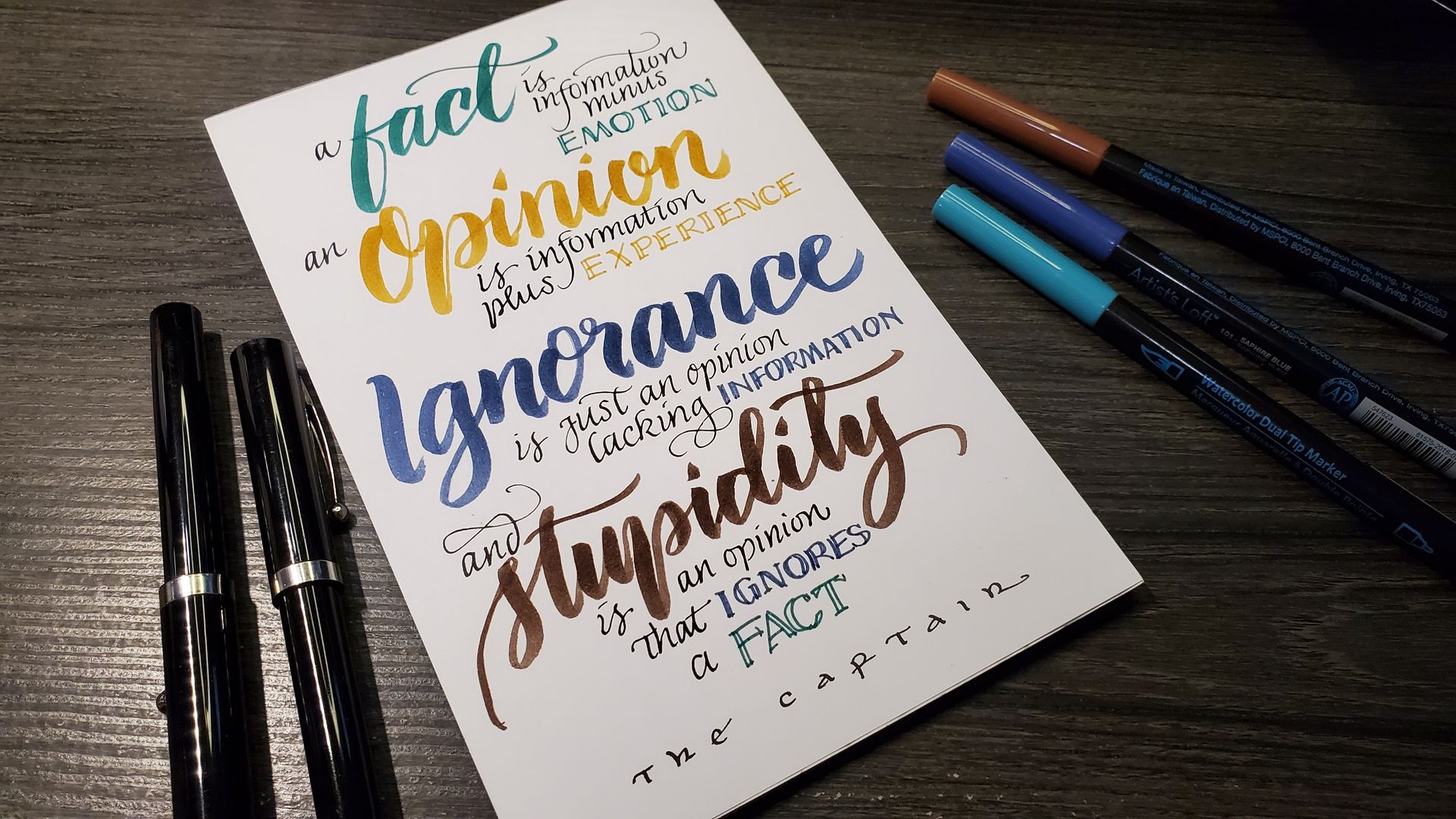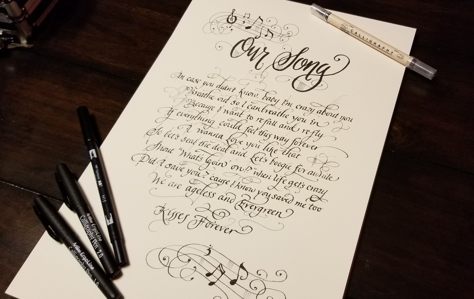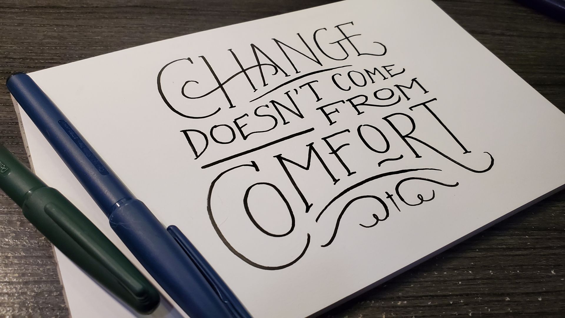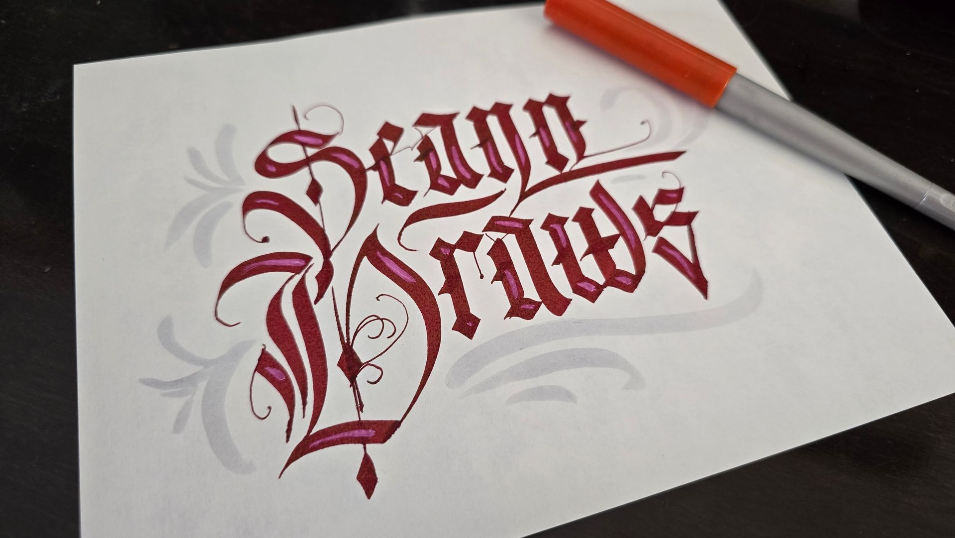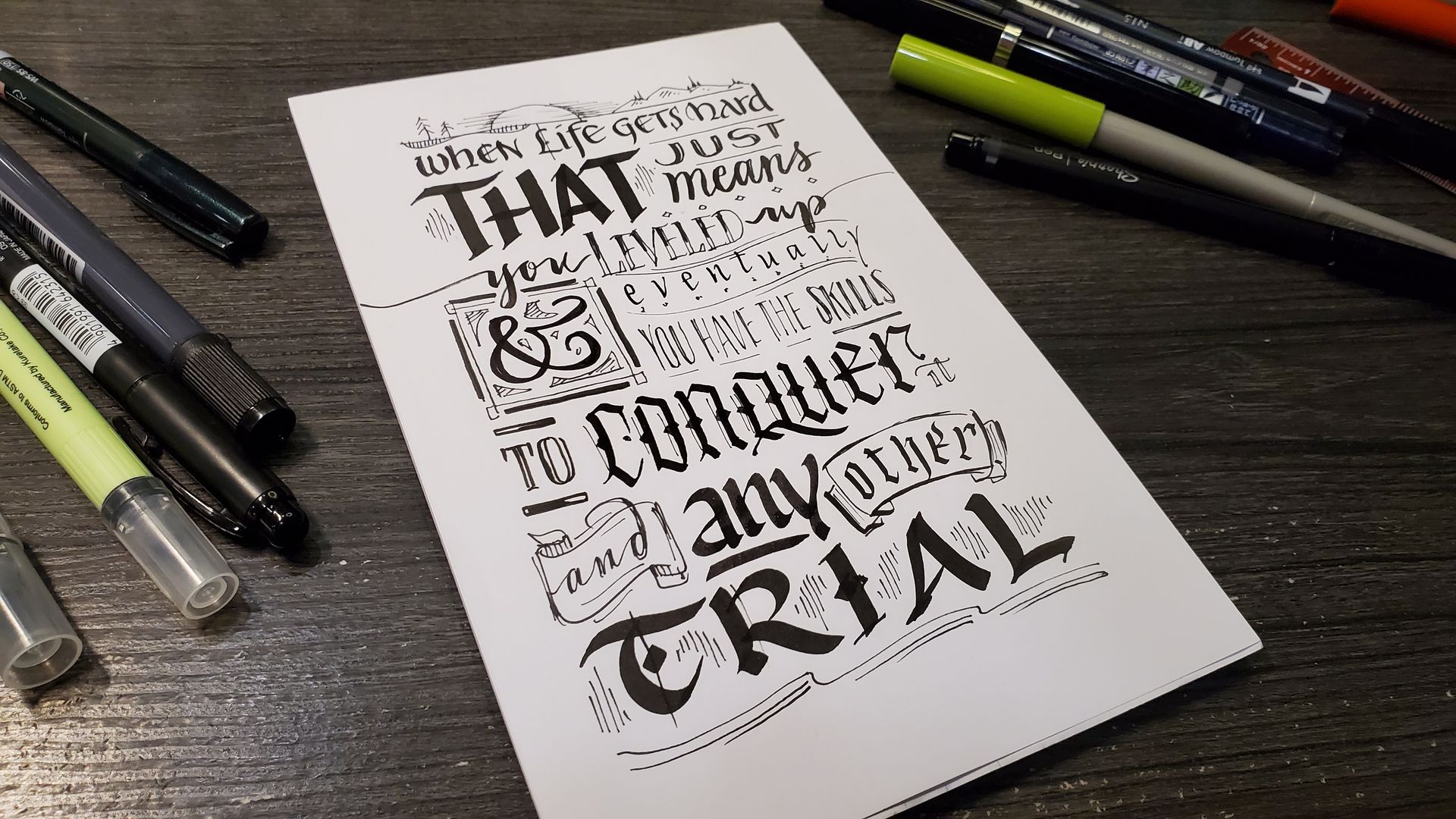 Hand-lettering in various styles using Pentel Plumix, Sheaffer, Pilot Parallels and Fudenosoke felt pens