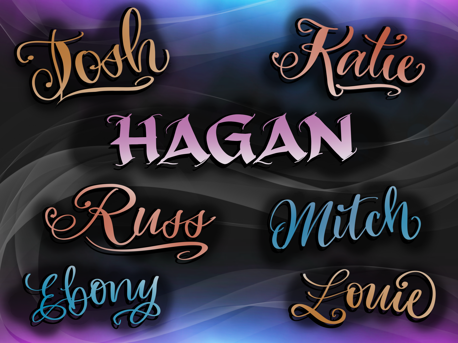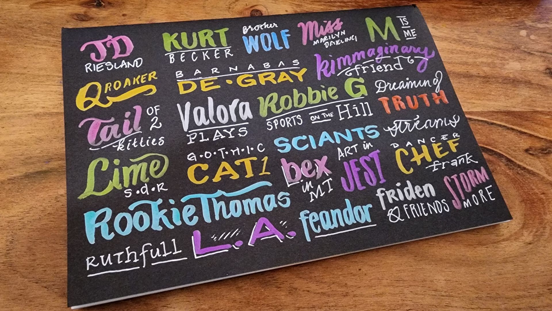 Fancified Twitch handles - both digital and in ink - using a variety of lettering styles, created LIVE by request from viewers